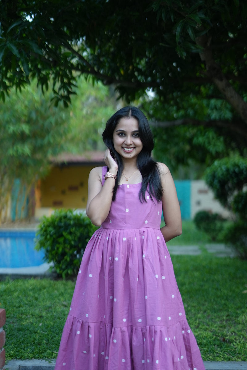 Pink & white handloom cotton tiered maxi