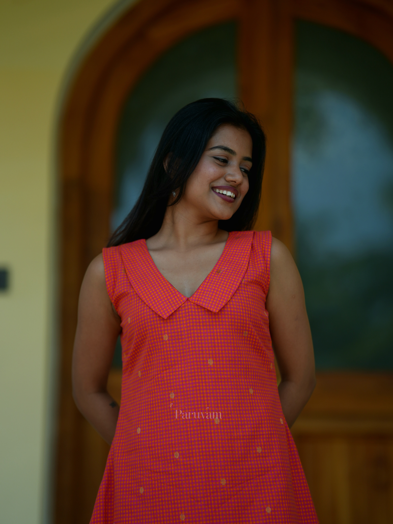 Orange mini checks collared A line dress