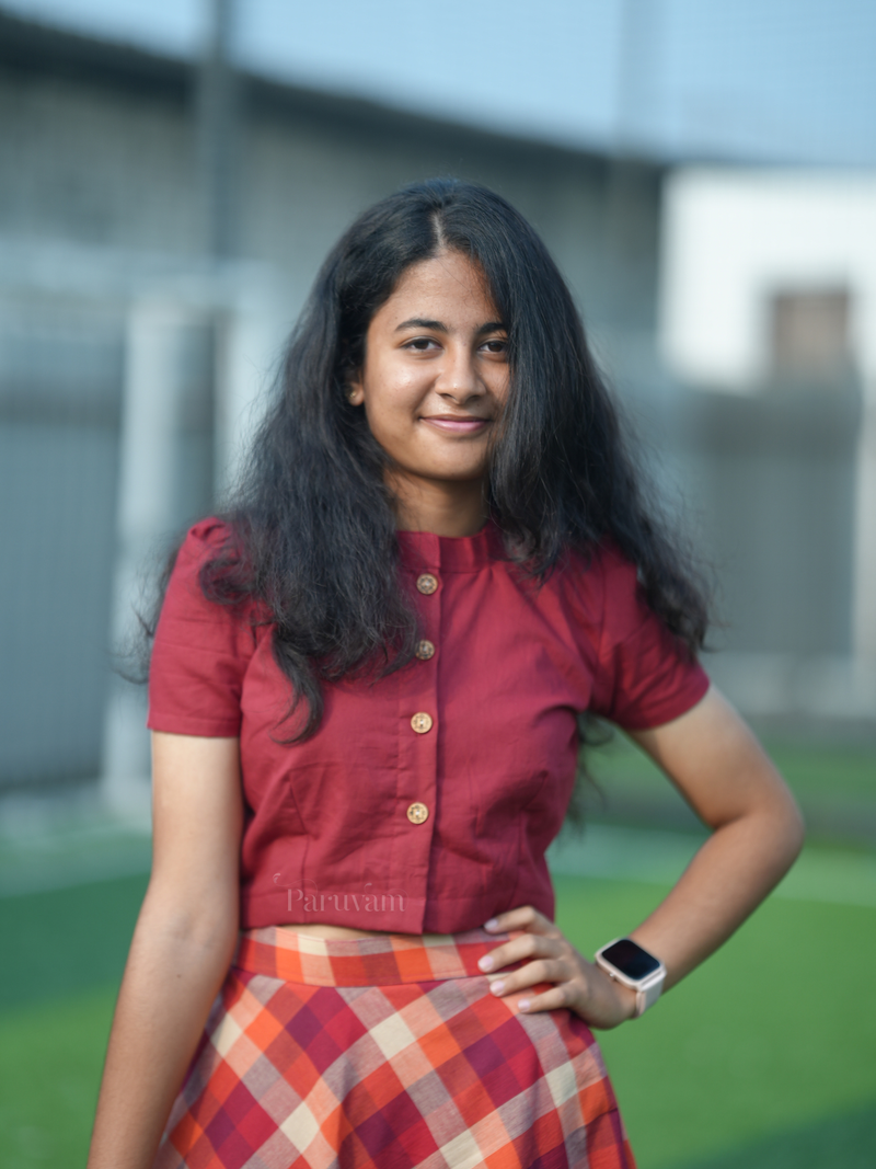 Red checkered midi skirt & plain top