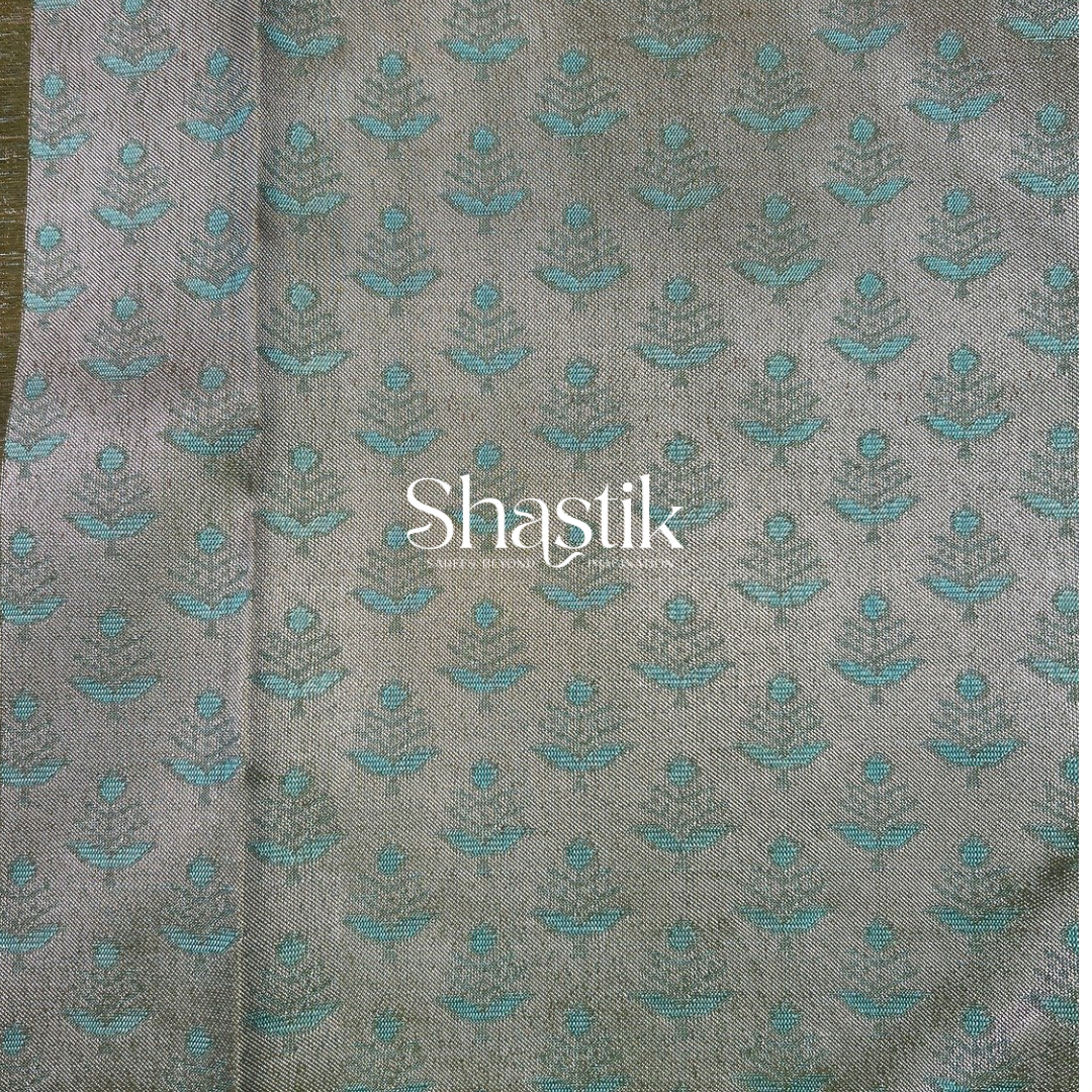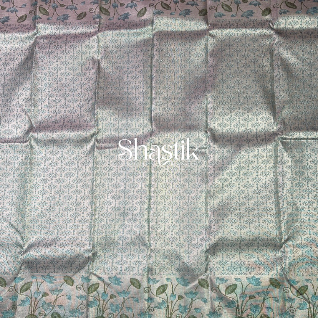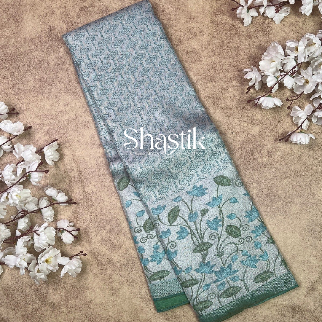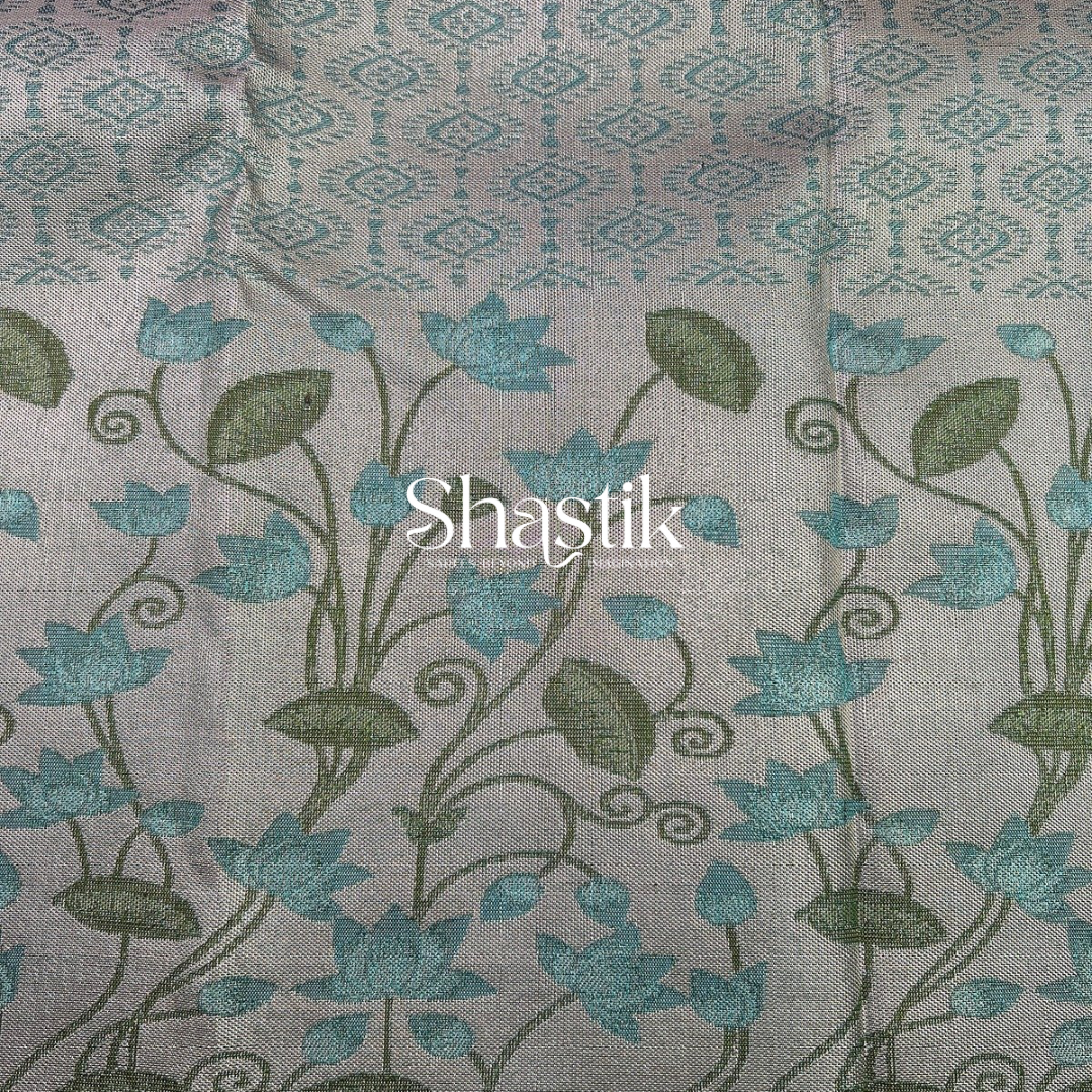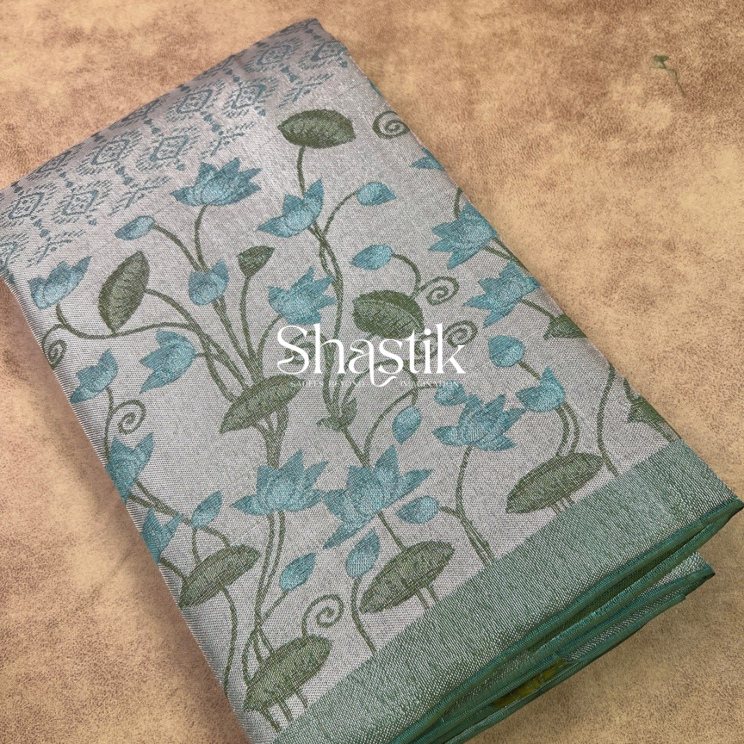 A contemporary silk saree with lotus floral pond patterns on both the sides of the saree and the body is woven with the tiny floral motifs. This saree comes in silver and blue. The pallu is woven with multiple patterns in the traditional way.