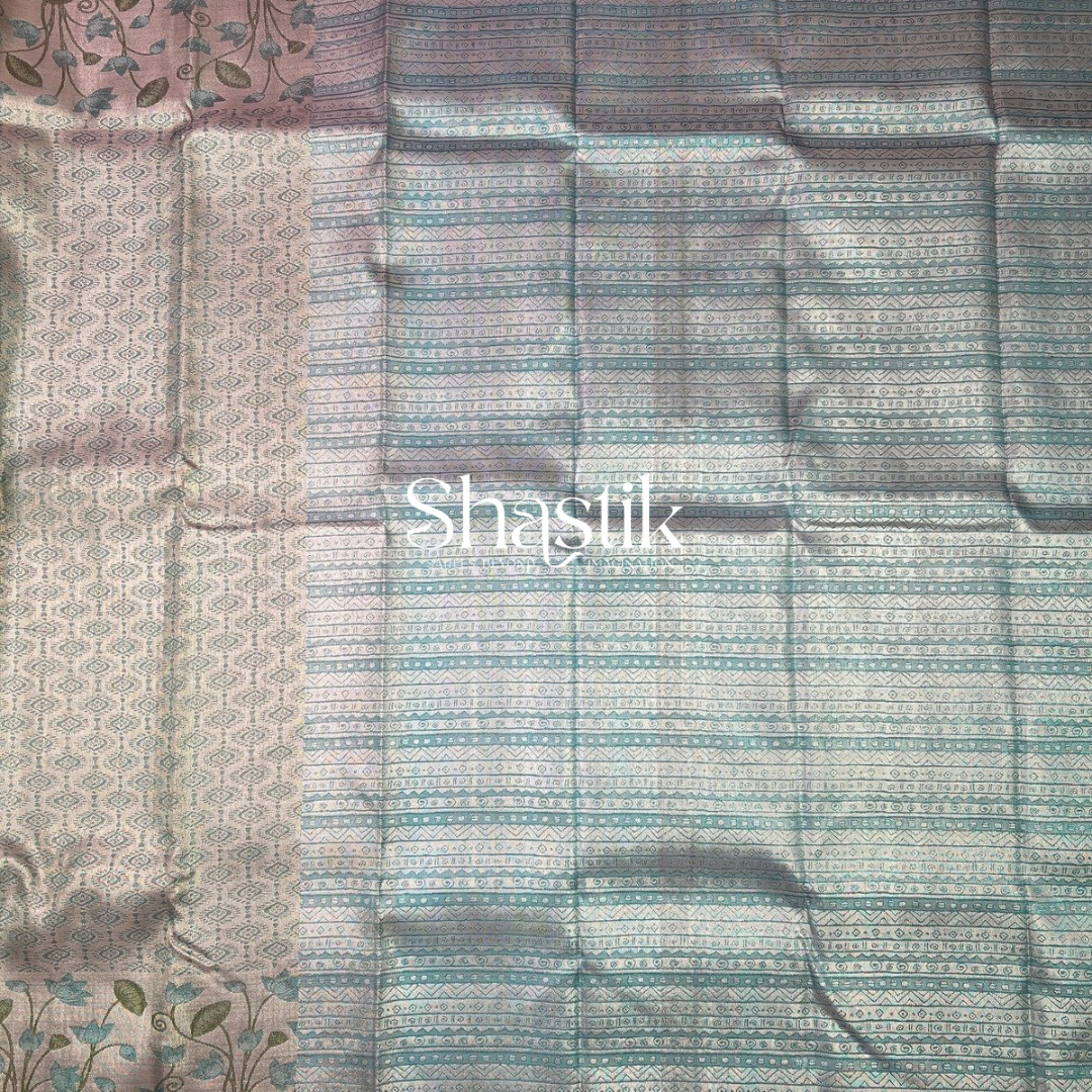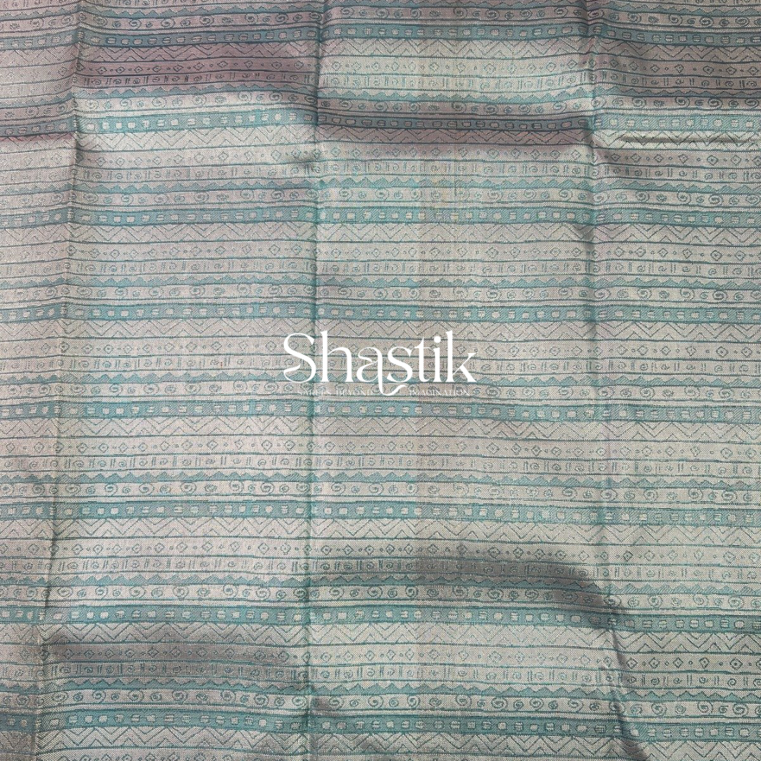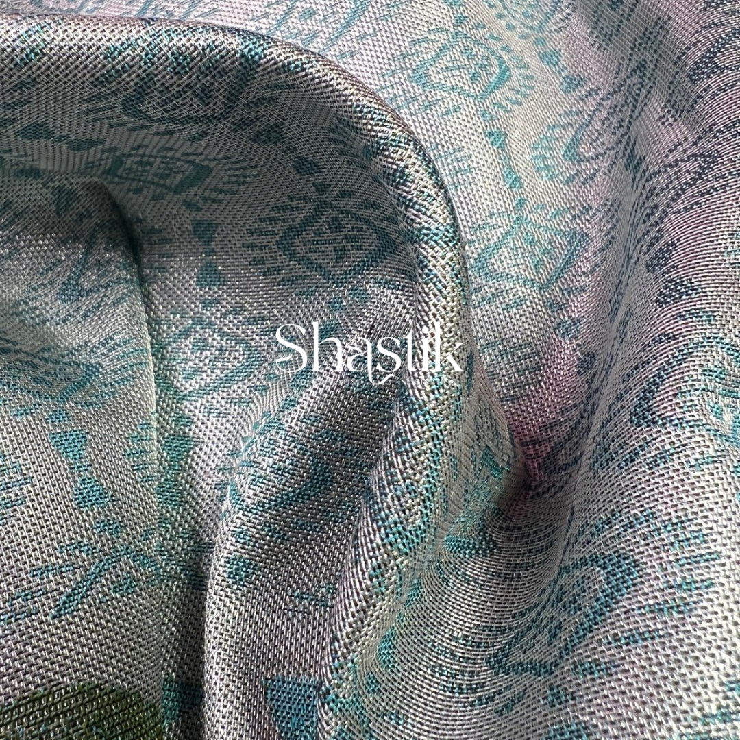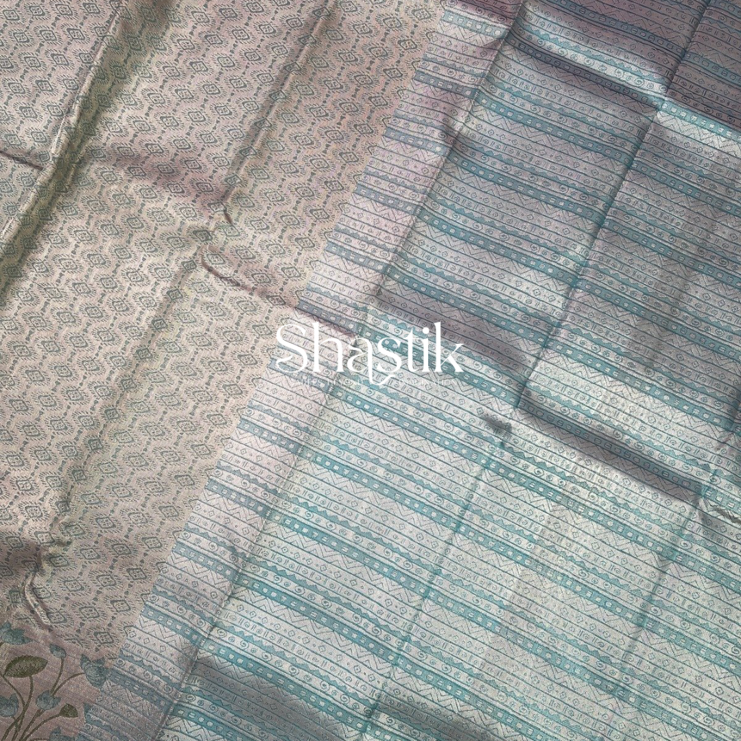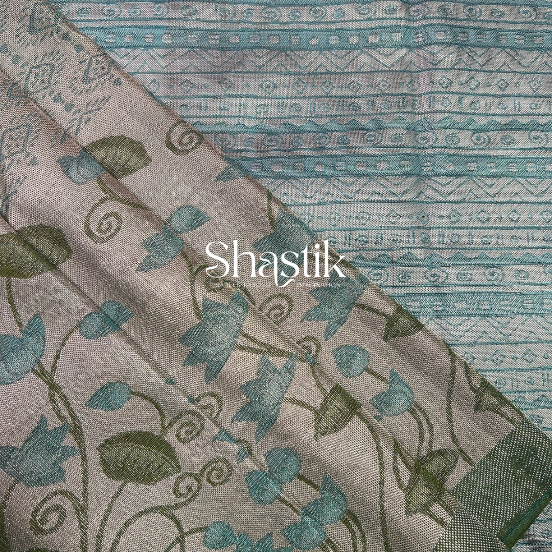 A contemporary silk saree with lotus floral pond patterns on both the sides of the saree and the body is woven with the tiny floral motifs. This saree comes in silver and blue. The pallu is woven with multiple patterns in the traditional way.