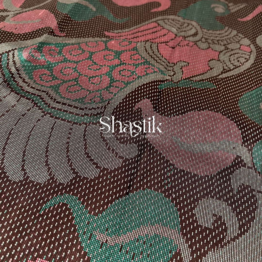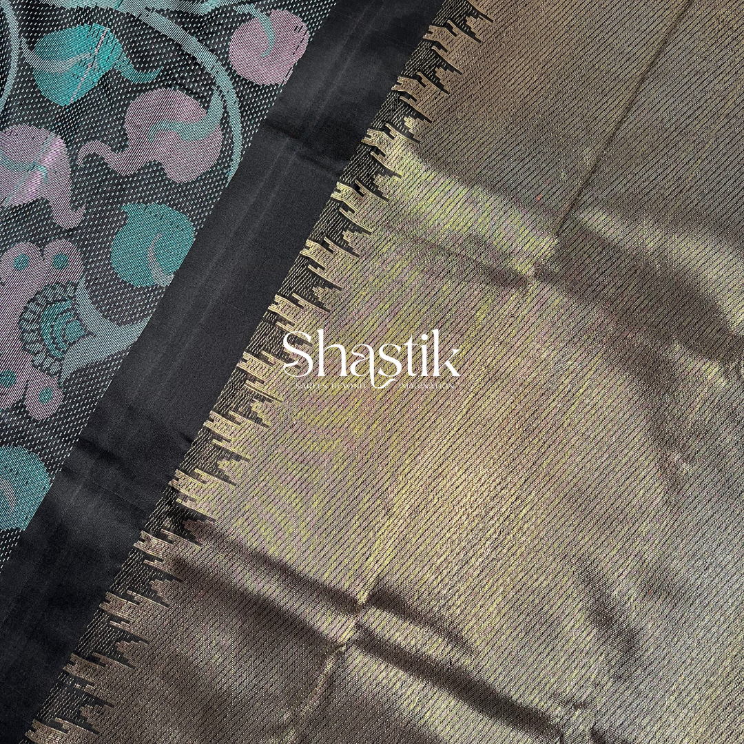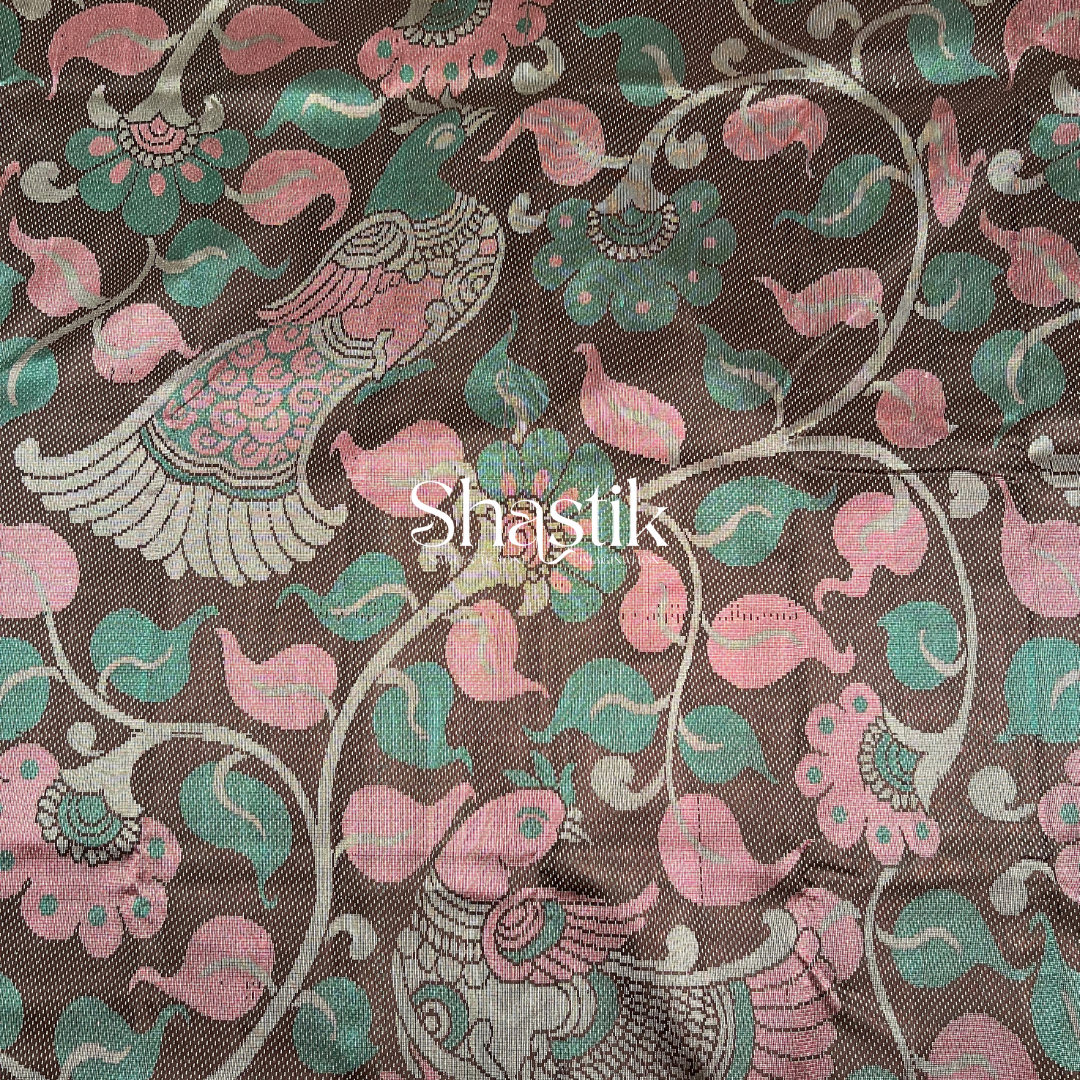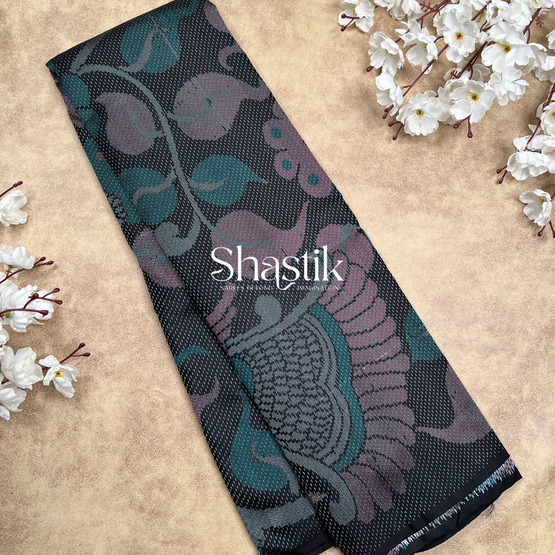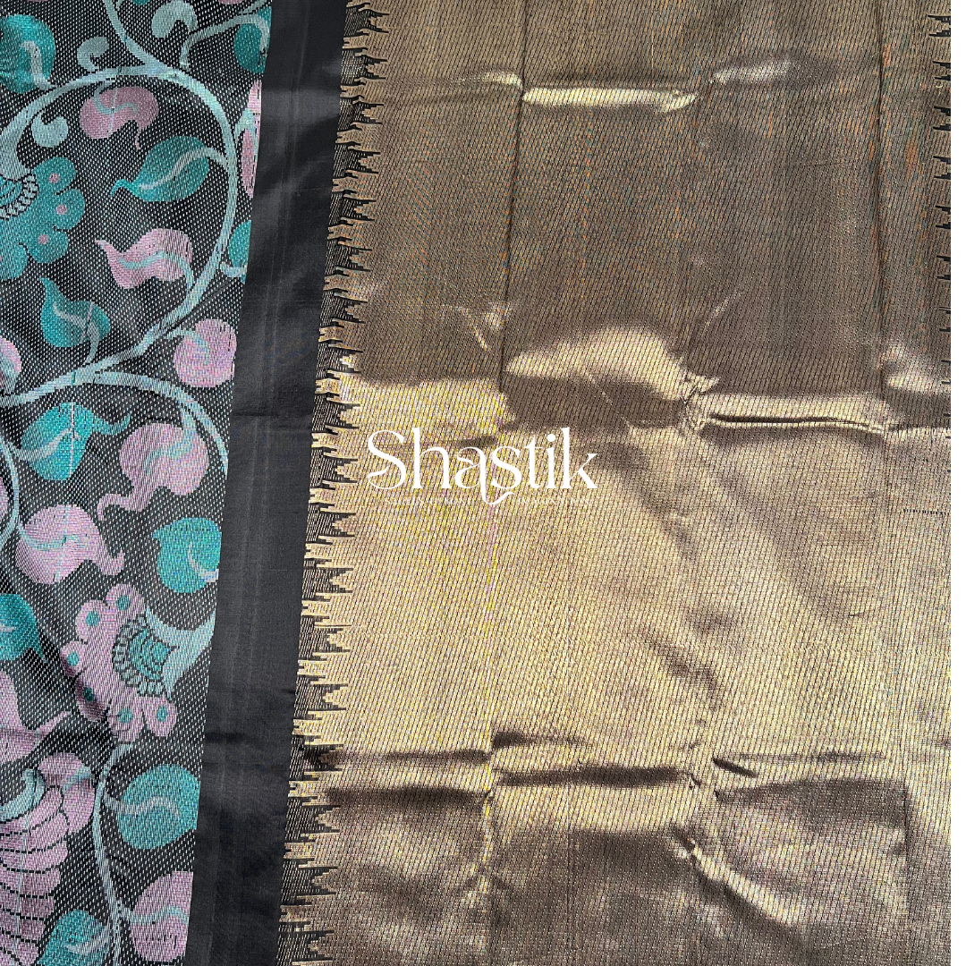 Explore an unconventional wedding Saree with this elegant black saree inspired by traditional Kalamkari art. The saree is adorned with beautiful designs of peacocks and floral veins in soft, multi-color tones. Its luxurious pallu is woven with German gold zari, and the borderless style adds a unique touch. Perfect for those seeking an unconventional wedding outfit!
