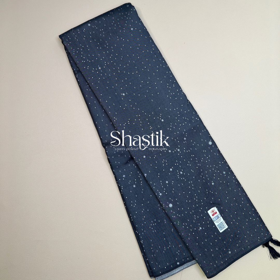 Black Silk Saree with Silver Zari Galaxy Pallu. Pure silk saree features a black body with silver zari, creating a mesmerizing night sky effect through small silver dots. The intricately woven pallu showcases a galaxy design, adding a touch of cosmic elegance to your wardrobe. Ideal for unconventional weddings, this saree offers a unique twist for bridal attire in Coimbatore. Paired with a plain black blouse, it ensures a timeless yet contemporary look. Perfect for brides seeking unconventional wedding dresses, this saree combines tradition with bold flair.